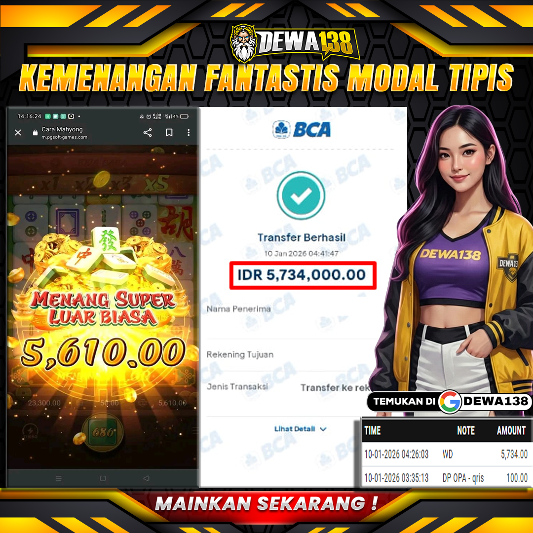 DEWA138 menghadirkan game jackpot vip yang di lengkapi fitur khusus new member hanya dengan modal deposit 100k dijamin akan withdraw 5,7+ juta malam ini.